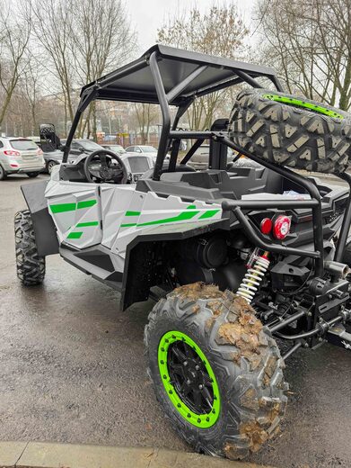 Двухместный баггиГотовы покорять бездорожье с комфортом? Наш двухместный багги – это идеальный спутник для охоты, рыбалки, экспедиций и экстремальных приключений. С мощным V-образным двигателем (799 см³, 59 л.с.) и жидкостным охлаждением он легко справляется с грязью, песком и снегом, работая на доступном АИ-92.Превосходная проходимость обеспечивается вариаторной трансмиссией с возможностью переключения между 2WD и 4WD, а также передним дифференциалом для лучшего сцепления. Независимая подвеска с двойными А-образными рычагами и ходом 110 мм (спереди) / 95 мм (сзади) гарантирует плавность хода даже на сложном рельефе. Опционально доступны азотные амортизаторы для еще большей выносливости.26-дюймовые шины (26x8 R14) с легкосплавными дисками и гидравлическими тормозами обеспечивают уверенное движение и мгновенную остановку. Клиренс 29 см позволяет преодолевать серьезные препятствия, а электрическая лебедка на 1600 кг выручит в самых сложных ситуациях.Комфорт и управляемость:Электроусилитель руля (EPS) – легкое и точное управление.