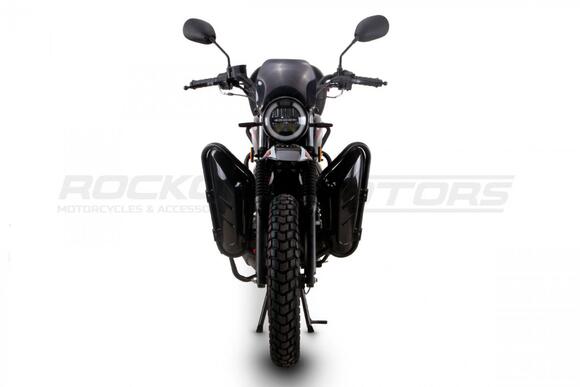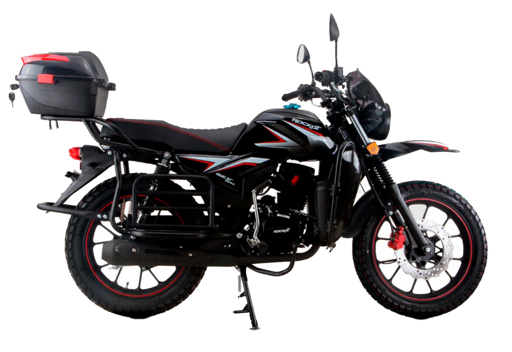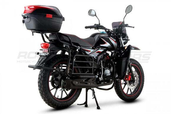 ROCKOT QUEST 150 - новый, дорожный мотоцикл от компании ROCKOT-MOTORS, с большим потенциалом на длительные поездки, независимо от типа дорожного покрытия. Благодаря своим компактным размерам, короткой колесной базе, мотоцикл отлично чувствует себя в городской среде с большим объемом дорожного трафика. Максимальная скорость ROCKOT QUEST 150 - до 92 км/ч на стандартных приводных звездах. Масса мотоцикла -126 килограмм, но при небольшой высоте по седлу в 820 мм и низкому центру тяжести, он ощущается достаточно легким.Мотоцикл имеет ЭПТС, оснащен цветной электронной панелью приборов, зеркалами, всей необходимой светотехникой, что позволяет законно передвигаться по дорогам общего пользования. ДизайнМотоцикл построен в классическом исполнении, но имеет множество современных, технологичных решений.Все световые приборы - светодиодные и очень яркие. Передняя фара имеет круглую классическую форму, но стоит ее включить, как мотоцикл обретает совершенно другой вид.Цветовая гамма модели имеет три варианта окраски: бело-красный, черный и серый.Конечно же, бросается в глаза оснащение мотоцикла туристической багажной системой. На заднем багажнике установлен жесткий центральный кофр. Откидные боковые багажники, позволяют перевозить объемный груз, а также устанавливать боковые багажные сумки. Глядя на мотоцикл, складывается впечатление, что все его пространство использовано максимально практично. Даже в дугах безопасности встроены дополнительные багажные карманы.Топливная системаВ основе топливной системы ROCKOT QUEST 150 - большой топливный бак объемом 12 литров. В зависимости от условий эксплуатации и стиля езды, расход топлива варьируется в районе 3-3,5 литров на 100 километров. Это позволяет преодолевать большие расстояния на одном баке бензина. Используемый тип топлива - бензин АИ-92. Образует топливную смесь - карбюратор PZ27 с ускорительным насосом. Ускорительный насос исключает момент “провала” при резком открытии дроссельной заслонки.Тормозная системаПо канонам классического мотоциклостроения, ROCKOT QUEST 150 имеет комбинированную тормозную систему. Спереди установлен дисковый гидравлический тормоз, с двухпоршневым суппортом, яркого красного цвета. Задний тормоз - механический, барабанный.Кому подойдет ROCKOT QUEST 150Мотоцикл будет очень полезен новичкам. Его небольшие габаритные размеры, низкий центр тяжести, малая высота по седлу - позволяют быстро освоить технику управления мотоциклом как в условиях города, так и бездорожья. С практичной точки зрения, мотоцикл понравится любителям выезжать на отдых за город. Отличная туристическая подготовка, позволит перевозить все, что Вам может потребоваться во время отдыха.Благодаря заложенной надежности в конструкцию двигателя и мотоцикла - ROCKOT QUEST 150 оценит старшее поколение, для кого требуется простая и надежная техника.