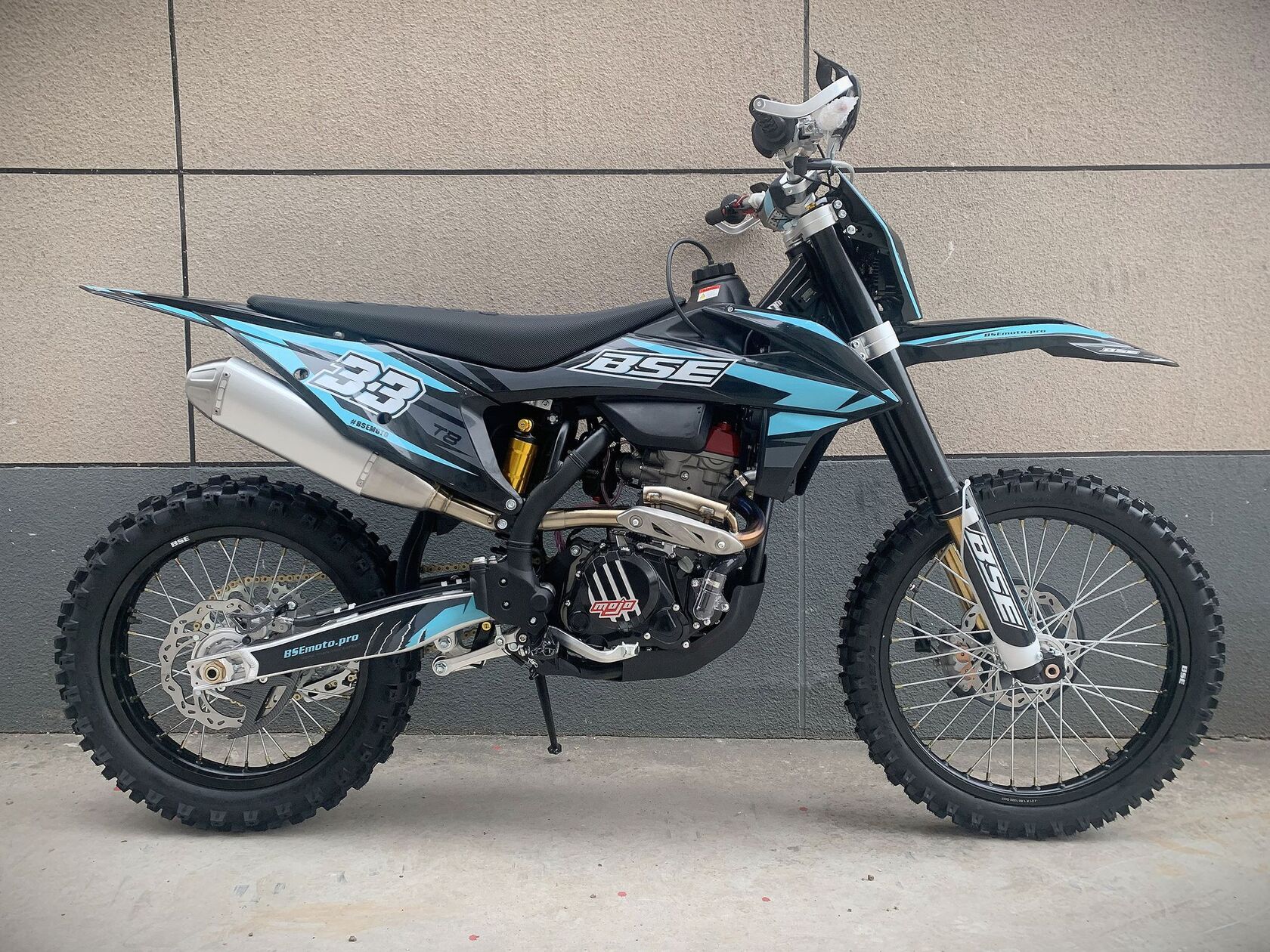 ДОПы New Высококачественная сталь, малый вес и большой запас прочности, идеальная развесовка. Мотоцикл оснащен легким алюминиевым подрамником, системой прогрессии и пластиковой защитой мотора. Установлен новый тип пластика - прочный, легкий и современный. T8 оборудован фирменной заводской спортивной подвеской BSE Mojo Racing. Подвеску легко настроить под любой рельеф, любую трассу и стиль езды.