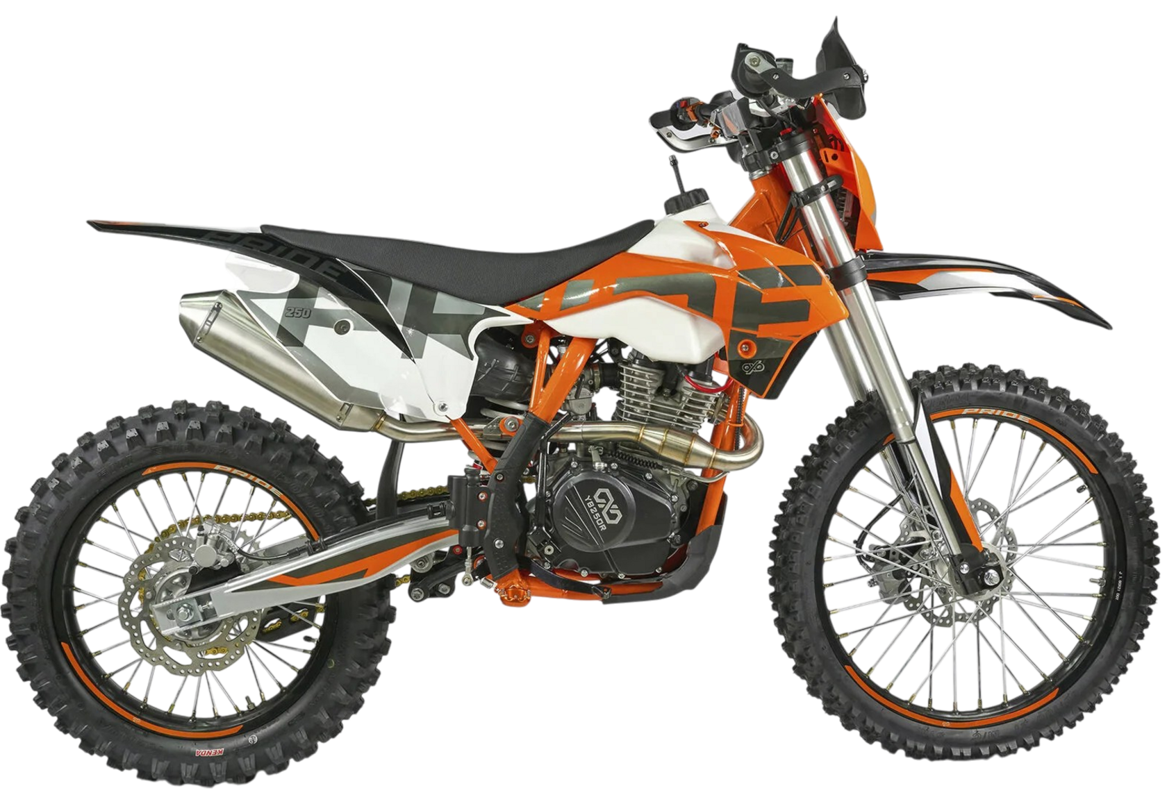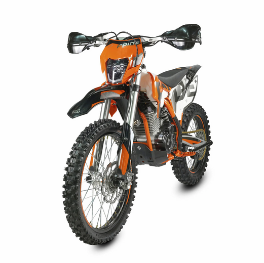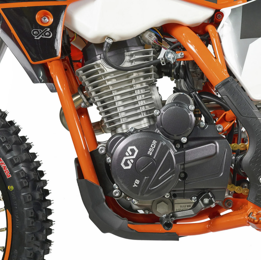 КомплектацияЭлектронная приборная панель, моточасы, подножки «AJ1» (алюминий 6063 с шипами), невозгораемый воздушный фильтр «AJ1» – Twin Air с увеличенной площадью, ведомая звезда «AJ1» (520, алюминий 7075-Т6), защита рук, грипсы OTOM/Lock-On, передние и задние буксаторы «AJ1», откидные алюминиевые рычаги 270, алюминиевая лапка КПП, пульт света КТМ, LED фара 5 линз.ДвигательМодель оснащена 1-цилиндровым 4-х тактным двигателем LONCIN YB250-R с воздушным охлаждением объёмом 249,9 см3, который выдаёт 23 л.с.ПодвескаПередняя вилка "MNT" перевернутого типа 51-54-830/37mm с регулировками. Моноамортизатор "MNT" также с регулировками. Система прогрессии, обеспечивает равномерную, мягкую работу и увеличивает длину рабочего хода подвески. Также ось крепления маятника совпадает с осью крепления ножки. Это существенно улучшает развесовку мотоцикла.КолесаСпереди и сзади установлены антибуксаторы бренда "AJ1", которые притягивают покрышку к ободу, позволяя ездить по бездорожью при низком давлении в камерах, не давая покрышке проворачиваться во время езды. Размер передней покрышки: 80/100 R21. Размер задней покрышки: 120/90-R18. Модель комплектуется "жирной" резиной "KENDA". Все эти характеристики позволяют мотоциклу отлично себя чувствовать в песке и грязи.Тормозная системаПолностью гидравлическая с армированными шлангами. Спереди и сзади установлен двухпоршневой суппорт. Данная конфигурация тормозных механизмов, позволяет быстро и безопасно оттормаживаться даже в самых непростых условиях.Сухой вес мотоцикла 108кг