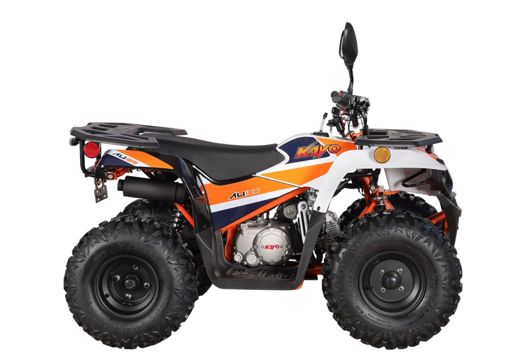 Квадроцикл KAYO AU125 – мощная внедорожная техника для весёлых заездов на природе. Наличие ПТС позволяет ездить по дорогам общего пользования. Габариты и мощность подходят для использования квадроцикла детьми от 11 лет.Оснащён одноцилиндровым 4-тактным двигателем YX154FMI объёмом 120 см³ с воздушным типом охлаждения. Обеспечивает мощность в 7,9 л.с. За подачу топлива отвечает карбюратор JK PZ22WL. Обеспечивает бесперебойную работу в самых жёстких условиях, лёгок в обслуживании и неприхотлив к качеству топлива. Трансмиссия имеет цепную передачу и автоматическую коробку с реверсом и схемой F-N-R. Ёмкость бака 4,5 литра.Диаметр колёс 8 дюймов. Подвеска спереди и сзади представлена амортизаторами длиной 265 мм. За торможение отвечает дисковая гидравлическая система.Квадроцикл оснащён комплектом светотехники для поездок в тёмное время суток и по дорогам общего пользования.Габариты квадроцикла 1430х860х890 мм, вес 98 кг.