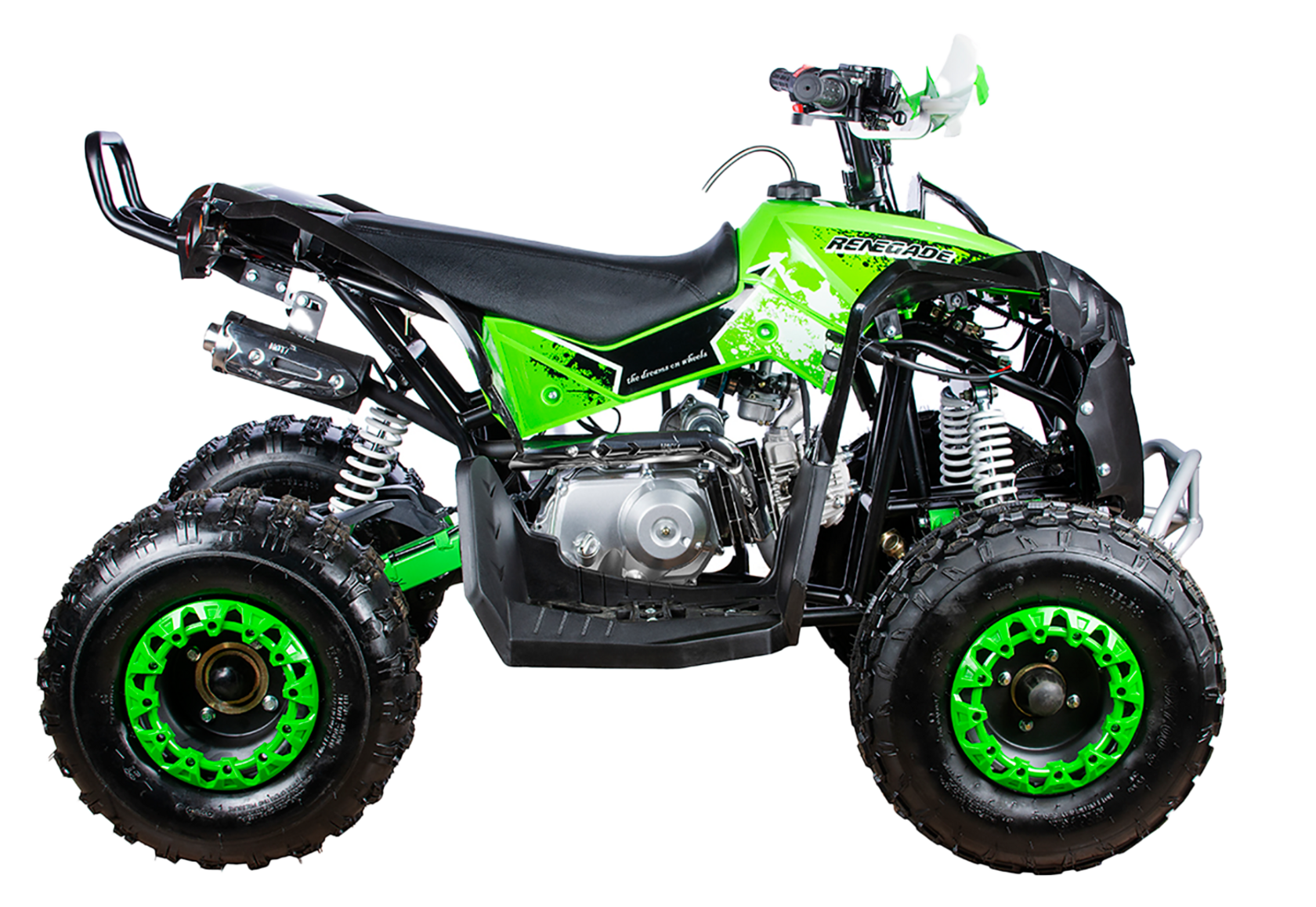 Квадроцикл бензиновый Yacota RENEGADE для детей от 7-ми лет и старше. Допустимая нагрузка 100 кг. Транспорт развивает скорость до 50 км/ч. Оборудован 4-х тактным 125 кубовым двигателем, мощностью 9 л.с. Трансмиссия автоматическая F-N-R. Система запуска - электростартер.