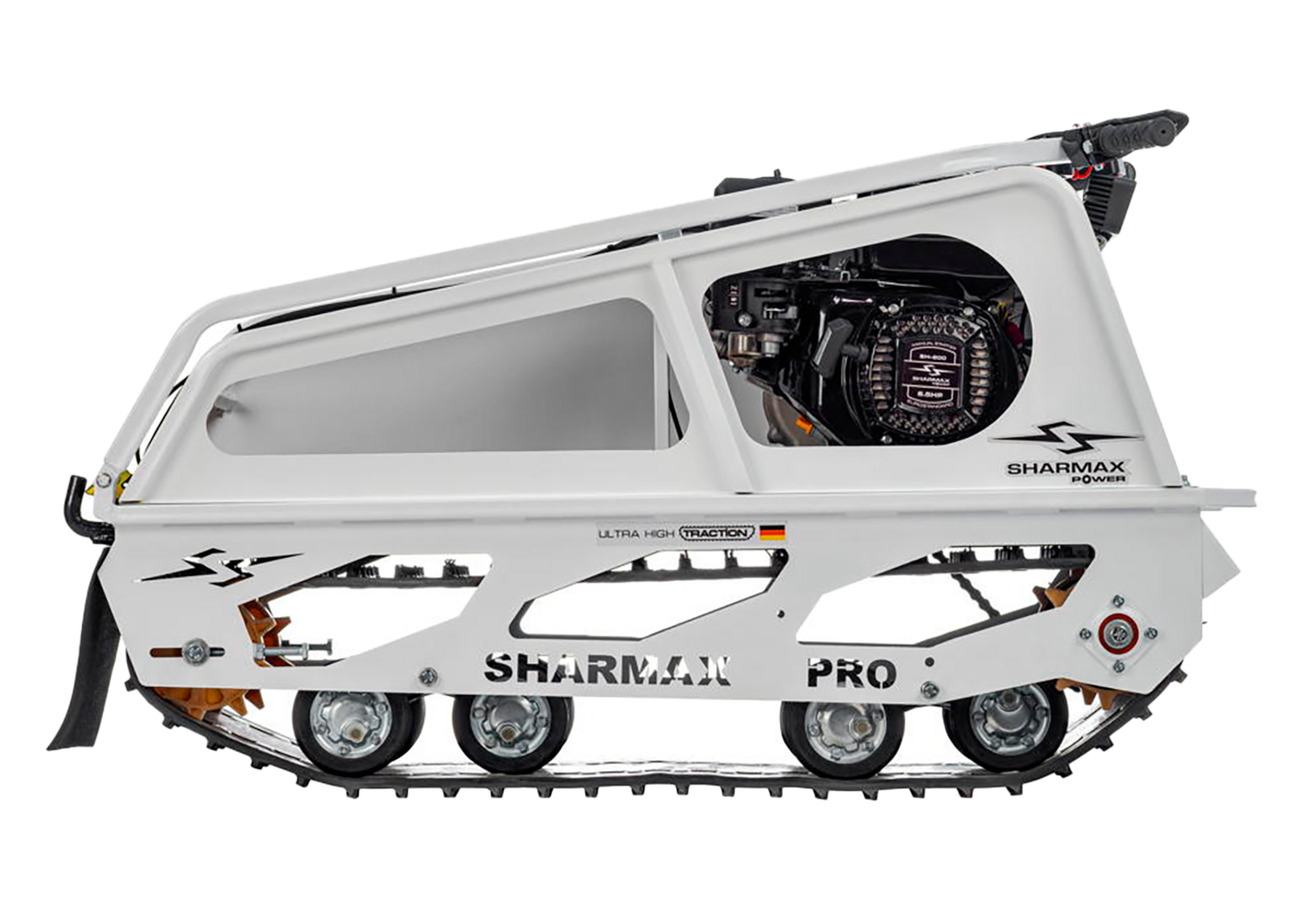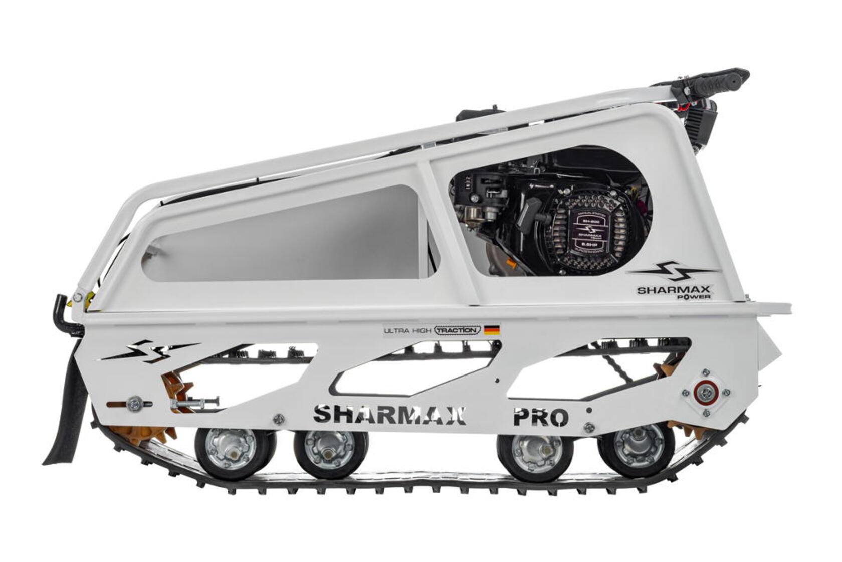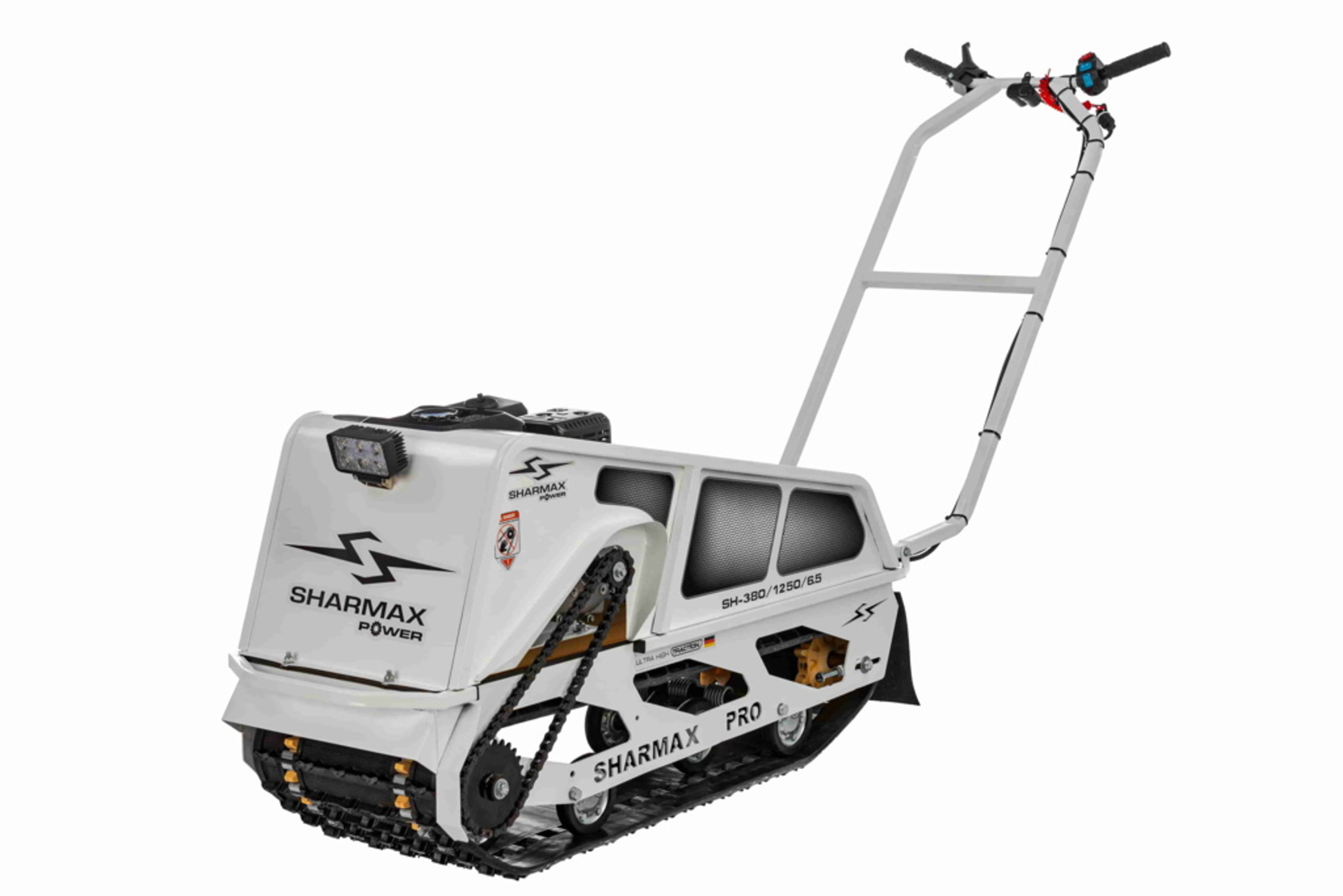 Мотобуксировщик SNOWBEAR S380 1250 HP8 MAXIMUM настоящий помощник на охоте и рыбалке, решит множество задач в сельскохозяйственной деятельности. Идеальное сочетание цены и качества.Гусеница мотобуксировщиков “Sharmax” шириной 380 мм, адаптирована для малогабаритных мотобуксировщиков длиной до 1450 мм. Обладает повышенной стойкостью к износу, а специальная форма протектора дает отличное сцепление с поверхностью, при этом сохраняя уверенную маневренность мотобуксировщика.