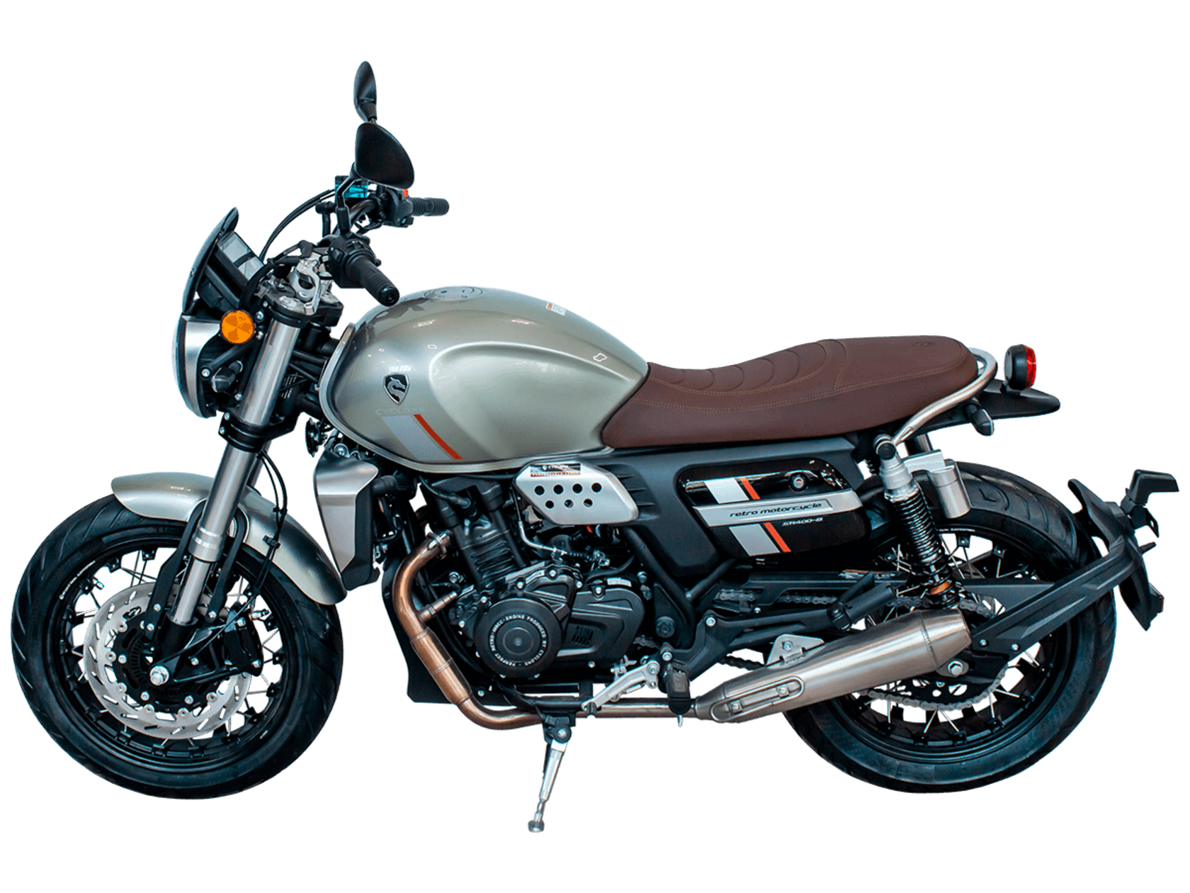 CYCLONE RE401 (SR400-B) 2024 – классик, в котором подчёркнутая простота объединяется с современными технологиями. Данная модель является более продвинутой версией модели RE3 (SR-400) – мотоцикл обладает более современным дизайном, снабжён стильными металлическими накладками на радиатор, а также топливным баком, объём которого увеличен до 20 литров.Двухцилиндровый четырёхтактный двигатель объёмом 401 см3 выдаёт 43 л.с. на 9500 об/мин. Инжекторный впрыск топлива с инжектором BOSCH увеличивает топливную экономичность, а также позволяет добиться высокой приёмистости и неприхотливости агрегата. Жидкостная система охлаждения не допустит перегрева двигателя даже при самом агрессивном вождении. На мотоцикл установлена 6-ступенчатая механическая коробка передач.Максимальная скорость мотоцикла составляет 150 км/ч.RE401 оснащён классическими спицованными колёсами диаметром 17 дюймов. Колёса обуты в бескамерные покрышки TIMSUN. С неровностями дороги эффективно справляются телескопическая вилка перевёрнутого типа спереди и маятник с двумя амортизаторами сзади. Ход передней подвески составляет 130 мм, задней – 81 мм. Оба компонента подвески являются регулируемыми. Эффективное и безопасное замедление с любых скоростей обеспечивают гидравлические дисковые тормоза с ABS спереди и сзади.Клиренс мотоцикла составляет 170 мм. Объём топливного бака – 20 л. Снаряжённая масса – 186 кг.Из дополнительного оборудования можно выделить USB-порт и датчики давления в шинах.Мотоцикл сочетает в себе отличные технические характеристики, комфорт и надёжность, что позволяет вам ощутить настоящую свободу на любой дороге.