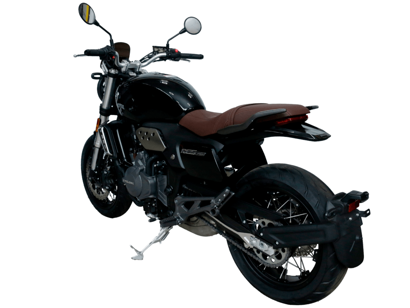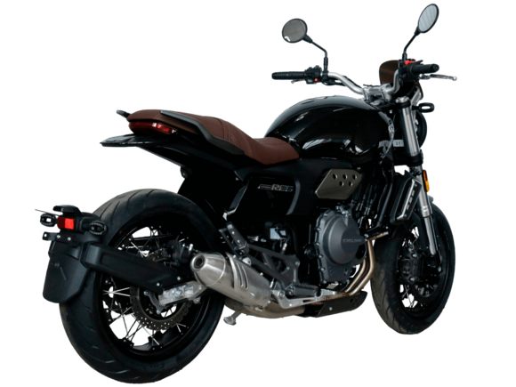 CYCLONE RE5 (SR600) – классик, в котором брутальная простота объединяется с современными технологиями. Данная модель является самой крупнокубатурной среди классических мотоциклов компании CYCLONE.Двухцилиндровый четырёхтактный двигатель объёмом 550 см3 выдаёт 60 л.с. на 8500 об/мин. Максимальный крутящий момент достигается на 6500 об/мин и составляет 55 Н·м. Инжекторный впрыск топлива с блоком управления BOSCH увеличивает топливную экономичность, а также позволяет добиться высокой приёмистости и неприхотливости агрегата. Жидкостная система охлаждения не допустит перегрева двигателя даже при самом агрессивном вождении. На мотоцикл установлена 6-ступенчатая механическая коробка передач.Максимальная скорость мотоцикла составляет 170 км/ч.RE5 оснащён классическими спицевыми колёсами диаметром 17 дюймов. Колёса обуты в бескамерные покрышки от легендарной фирмы PIRELLI. С неровностями дороги эффективно справляются телескопическая вилка перевёрнутого типа спереди и маятник с моноамортизатором сзади. Ход передней подвески составляет 120 мм, задней – 50 мм. Оба компонента подвески являются регулируемыми. Эффективное и безопасное замедление с любых скоростей обеспечивают гидравлические дисковые тормоза с ABS спереди и сзади. Тормозные системы произведены известной испанской фирмой J.JUAN (входящей в легендарный холдинг BREMBO).Клиренс мотоцикла составляет 155 мм. Объём топливного бака – 20 л. Снаряжённая масса – 204 кг.Из дополнительного оборудования можно выделить USB-порт и датчики давления в шинах.Мотоцикл сочетает в себе отличные технические характеристики, комфорт и надёжность, что позволяет вам ощутить настоящую свободу на любой дороге.