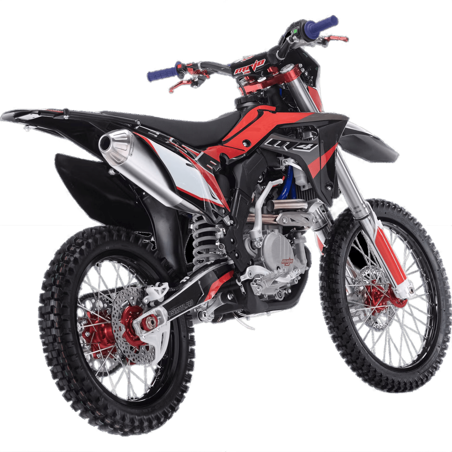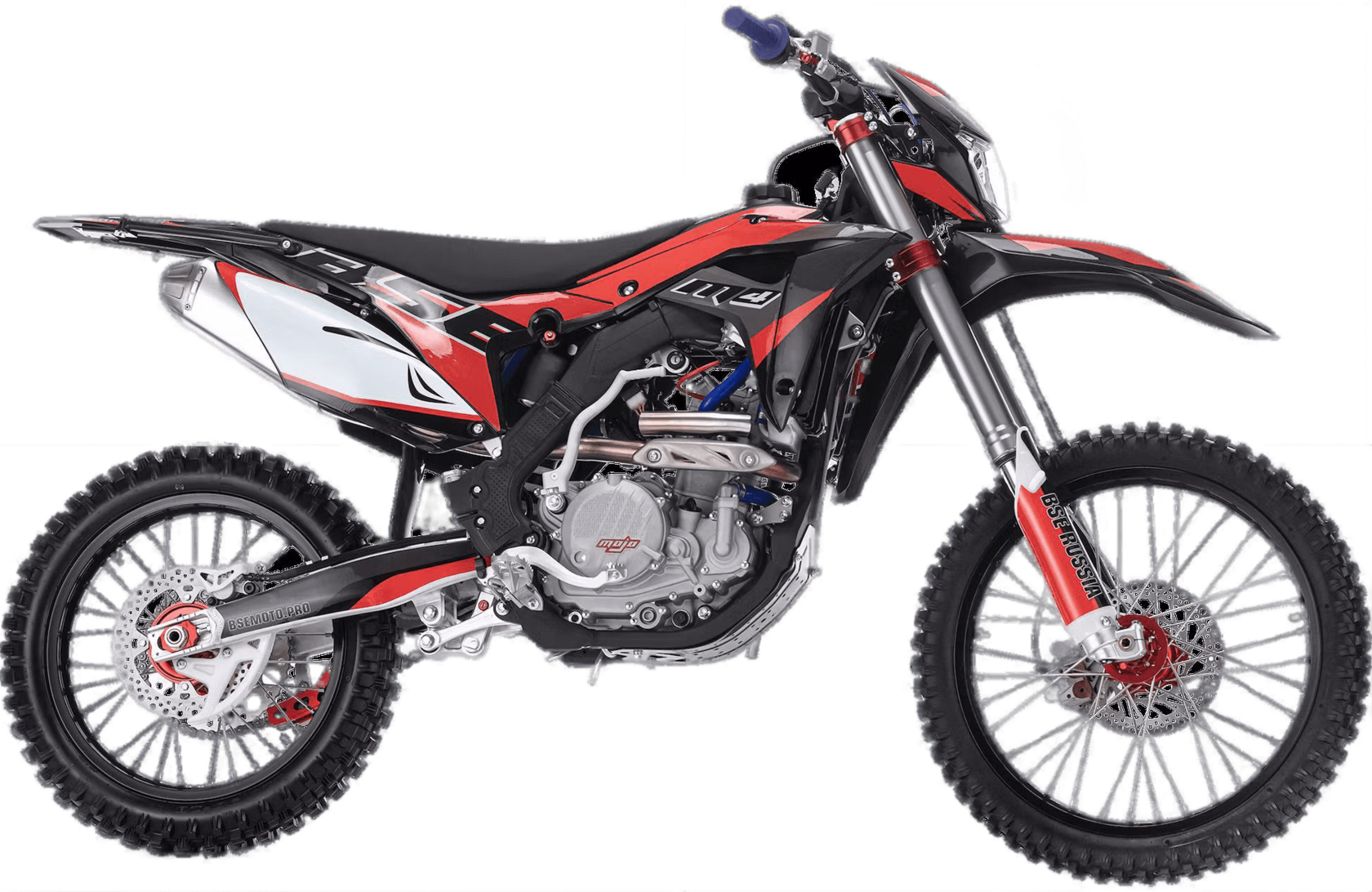 ДОПы New Рама запатентованной заводом Bosuer. M4 уже в заводской комплектации готов к покорению серьезного бездорожья и участия в соревнованиях. Подвеска MOJO c большими ходами имеет полный диапазон регулировок и помогает отрабатывать даже самые жесткие приземления, с лёгкостью "проглатывает" все неровности. Установлена вилка “перевертыш” Mojo Racing c “толстыми” перьями диаметром 57 мм с двумя картриджами. Идеальная развесовка и сбалансированность конструкции мотоцикла даёт преимущество при прохождении острых поворотов и подъёмов. На мотоцикле установлено все необходимое для оффроуда: литые рычаги задней прогрессии, алюминиевый маятник, прочный задний бугель, “злая” внедорожная резина.