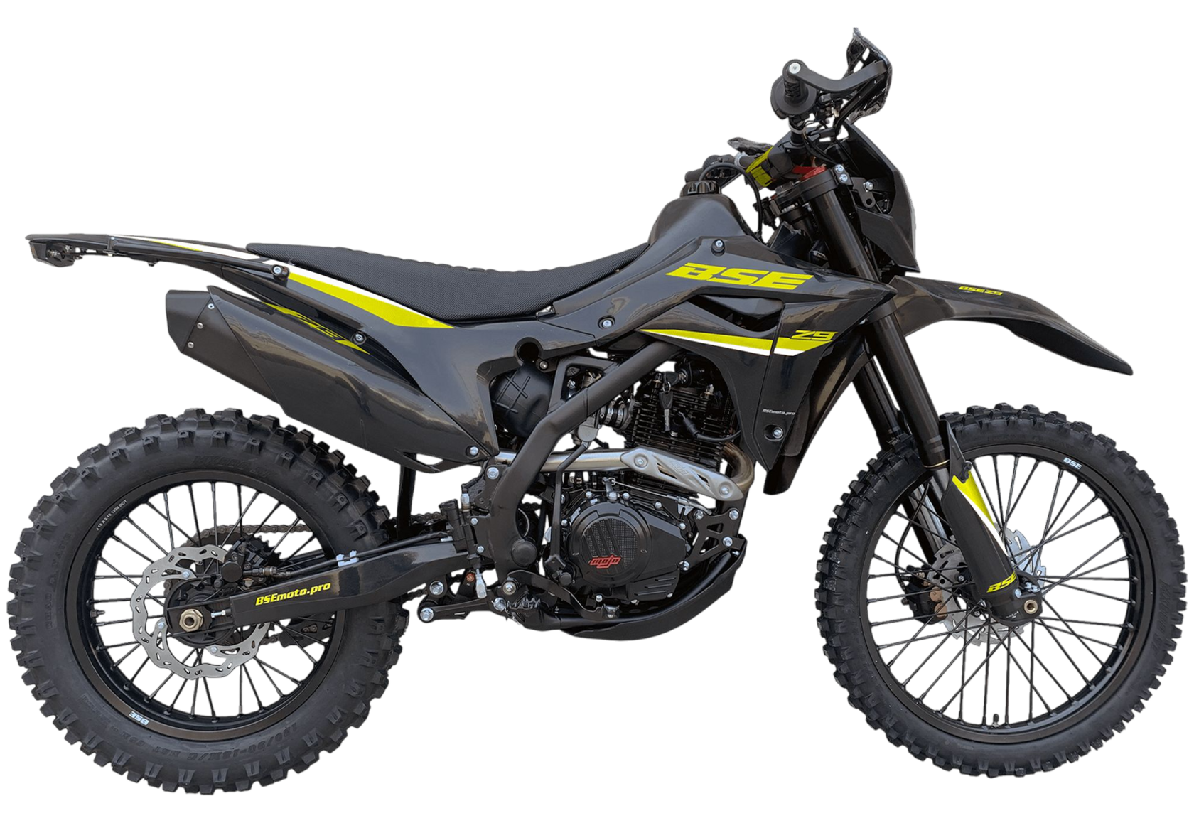 BSE Z9 Yellow Metallic S (ZS175 FMM-5) — мощный и выносливый эндуро-мотоцикл с 4-тактным двигателем объёмом 300 см³ и мощностью 25 л.с. Оснащён усиленной хромомолибденовой рамой, регулируемой подвеской SX, карбюратором NB-PE30 и электростартером. Двигатель: Zongshen ZS175 FMM-5 – МКПП: 5 передач