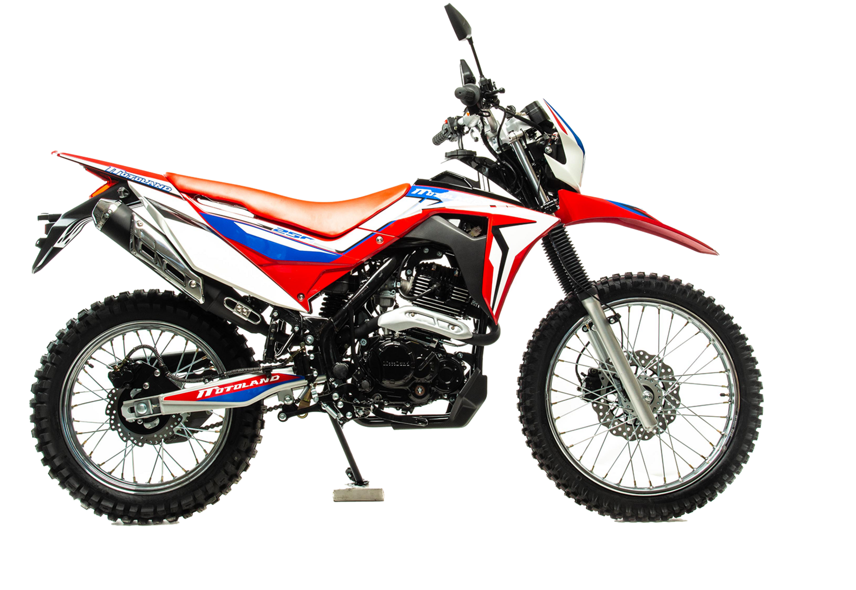 Дизайн данного мотоцикла навеян легендарным HONDA CRF250 L: в расцветке преобладает насыщенный красный цвет с синими-белыми элементами, дополненными эффектными карбоновыми вставками.CRF LT ENDURO относится к недорогим полноразмерный мотоциклам двойного назначения – для асфальта и легкого бездорожья. Наличие ПТС дает им возможность легально передвигаться по городским улицам и дорогам общего пользования, а внедорожные качества позволяют без особых усилий преодолевать бездорожье.Мотоцикл маневренный и потрясающе удобный в городе, из за своей узкой и высокой формы, способный пролезть даже в минимальные зазоры между стоящими в пробке автомобилями. Максимальную скорость – 120 км/ч которой для города и неспешных прогулок за его пределы вполне достаточно.Мягко сидение для 2-х пассажиров и подножки пассажира для удобных совместных поездок.Оснащается светодиодными поворотниками и стоп сигналами, блокировкой замка зажигания.Скромный расход топлива, который почти не зависит от того, с какой скоростью едет мотоцикл и на каких оборотах работает двигатель, в среднем это 3,2-3,5 л на 100 км.При этом он прост в управлении и неприхотлив в обслуживании и подходит мотолюбителям любого возраста,и опыта вождения которым нужна техника для поездок из точки А в точку Б и обратно по дорогам и легкому бездорожью.Технические характеристикиMotoland CRF LT ENDURO оснащен одноцилиндровым четырехтактным двигателем с воздушным охлаждением.Двигатель (170 FMN) объемом 250 см³.Балансирный вал с которым вибрации практически не будут ощущатьсяКарбюратор PZ 32.