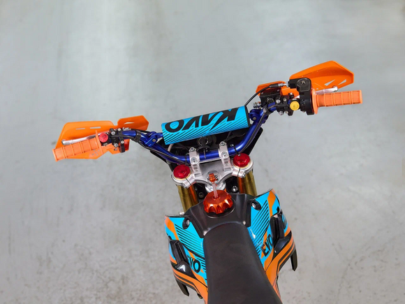 Питбайк KAYO Evolution YX140EM 17/14 KRZ – отличный снаряд для внедорожного экстрима, который подходит как новичкам, так и опытным райдерам. Это удобный, простой и надёжный мотоцикл, полностью оправдывающий свою цену.Оснащён одноцилиндровым 4-тактным двигателем YX1P56FMJ объёмом 140 см3 с воздушно-масляным охлаждением. Выдаёт мощность в 11 л.с. Карбюратор NIBBI PE19 обеспечивает бесперебойную работу техники в самых жёстких условиях. Лёгок в обслуживании и неприхотлив к качеству топлива. Имеет механическую коробку передач с 4 ступенями и схемой N-1-2-3-4. Лапка у КПП складная. Запуск двигателя осуществляется с помощью кнопки на руле или рычага кикстартера. Ёмкость бака 5,7 литра.Руль и колёса выполнены из прочного алюминиевого сплава. Колёса имеют диаметр 17 и 14 дюймов и обуты в агрессивную кроссовую резину. Подвеска спереди представлена телескопической вилкой перевёрнутого типа длиной 770 мм, а сзади – моноамортизатором длиной 360 мм. Тормоза дисковые гидравлические.Размер 1850х850х1290 мм, вес 78 кг. Высота по седлу 885 мм.Мотоцикл оснащён светодиодной оптикой, позволяющей устраивать заезды даже в тёмное время суток.