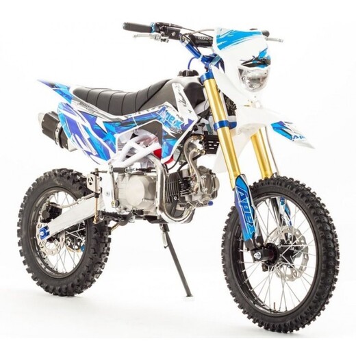 Недорогой надёжный питбайк APEX14 идеален для поездок по грунтовым дорогам и бездорожью. Хорошо чувствует себя на мягком и среднем грунте, разгоняется до 100 км/ч. Оснащён CNC траверсами, фарой, весит всего 70 кг. Питбайк прост в управлении и не требует специального ухода, подойдёт как новичкам, так и любителям мотокросса. У кроссового мотоцикла APEX14 отличный узнаваемый дизайн. Конструкция подчёркивает неуступчивый спортивный характер питбайка, который не остановится ни перед одним препятствием. Пластик комбинированный, прочный, не ломается при сгибании. Кроссовый мотоцикл APEX14 доступен в красном и синем цвете, при этом в основной цвет окрашен не только пластик, но и обода колёс и другие детали питбайка. Передняя подвеска — телескопическая нерегулируемая вилка перевёрнутого типа, которая отлично подходит для преодоления ям, ухабов и других неровностей плохих дорог или их отсутствия. Задняя подвеска маятниковая с моноамортизатором. Руль 22 мм с высоким подъёмом и перекладиной удобен для мотоциклистов разного роста. Ручки руля — комфортные PRO TAPER. Питбайк оснащён складными рычагами сцепления и переднего тормоза, а также CNC-лапкой переключения передач. Питбайк весит всего 70 кг, при этом выдерживает вес до 150 кг. Оснащён CNC траверсами, рама полудуплексная стальная, мотоцепь качественная. Колёса спицованные, сделаны из прочного и лёгкого алюминия. Размер заднего колеса — 14 дюймов (350 мм), переднего — 17 дюйм (430 мм). Тормоза дисковые, передний тормозной суппорт двухпоршневой, задний — однопоршневой. Питбайк оснащён карбюратором с фильтром нулевого сопротивления VM26 MIKUNI и одноцилиндровым четырёхтактным двигателем с воздушным охлаждением. Надёжный мотор мощностью 11 л. с. и объемом 140см³ разгоняет кроссовый мотоцикл APEX14 до 100 км/ч. Коробка передач механическая, четырёхступенчатая. Система зажигания электронная (CDI), для запуска двигателя можно использовать кикстартер. Покрышки с шипами и высоким грунтозацепом идеальны для бездорожья. Мощность мотора и небольшой вес питбайка позволяют ему преодолевать значительные препятствия и непролазную грязь, хорошо заходить в подъёмы. Также в комплекте есть щиток для номера, который ставится вместо фары. Питбайк 140 относится к недорогим моделям, которые при должной эксплуатации работают без сбоев и капризов. Кросс неприхотлив в обслуживании, не занимает много места в гараже. При необходимости в нём легко сменить любую повреждённую деталь.У нас Вы можете купить этот питбайк с бесплатной доставкой по РФ и гарантией до года. Также его можно приобрести в рассрочку или в кредит.