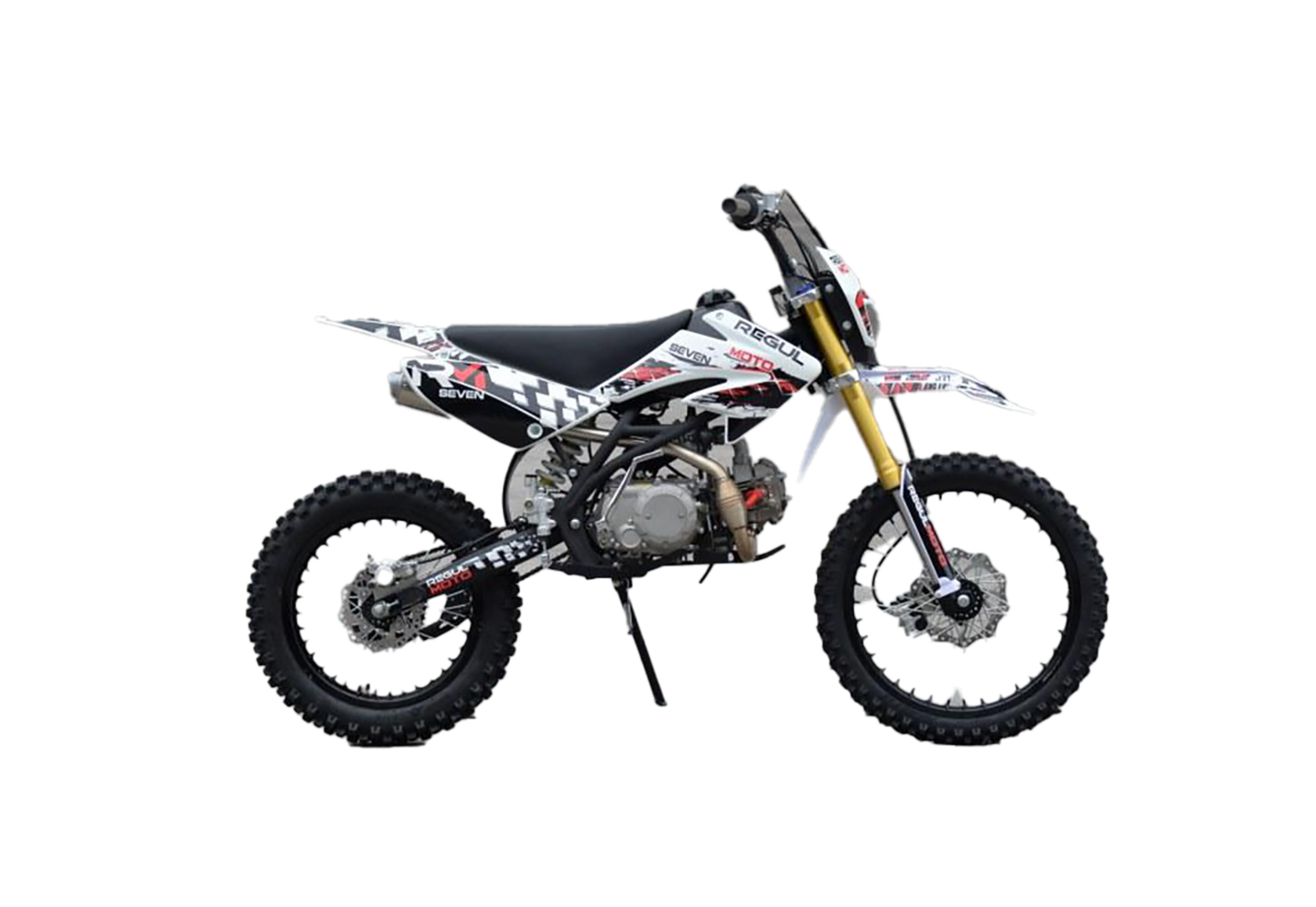Представляем вниманию поклонников офф-роада питбайк Regulmoto SEVEN MEDALIST 150E – новинку мототехники Regulmoto модельного ряда 2021 года. У нас Вы можете купить этот питбайк с бесплатной доставкой по РФ . Также его можно приобрести в рассрочку или в кредит.Regulmoto SEVEN MEDALIST 150E – оптимальный выбор для райдера, который позволит своему владельцу совершенствовать навыки управления мототехникой на треке мотостадиона, а также получать максимальное удовольствие от офф-роад рейдов.В раме Regulmoto SEVEN MEDALIST 150E установлен 140-кубовый 4-тактный YX(X150) – этот двигатель отлично себя зарекомендовал в качестве надежного и простого силового агрегата. Подготовкой топливной смеси занимается карбюратор Nibbi. Запуск мотора возможен как при помощи тумблера электростартера, так и привычной ножкой кика. Колеса питбайка размером 17/14 дюймов с усиленными алюминиевыми ободами на 36 спиц «обуты» в качественную кроссовую моторезину Kenda. Установленные на колесах буксаторы предотвратят проворачивание покрышки и защитят камеры от возможных повреждений. Питбайк комплектуется фарой головного света; она включается при помощи поворота ключа в замке зажигания. В качестве элементов защитного обвеса используются пластиковые обтекатели типа CRF. Подбор комплектующих свидетельствует о полной готовности питбайка к покорению бездорожья. Среди стоковых компонентов питбайка стоит отметить: