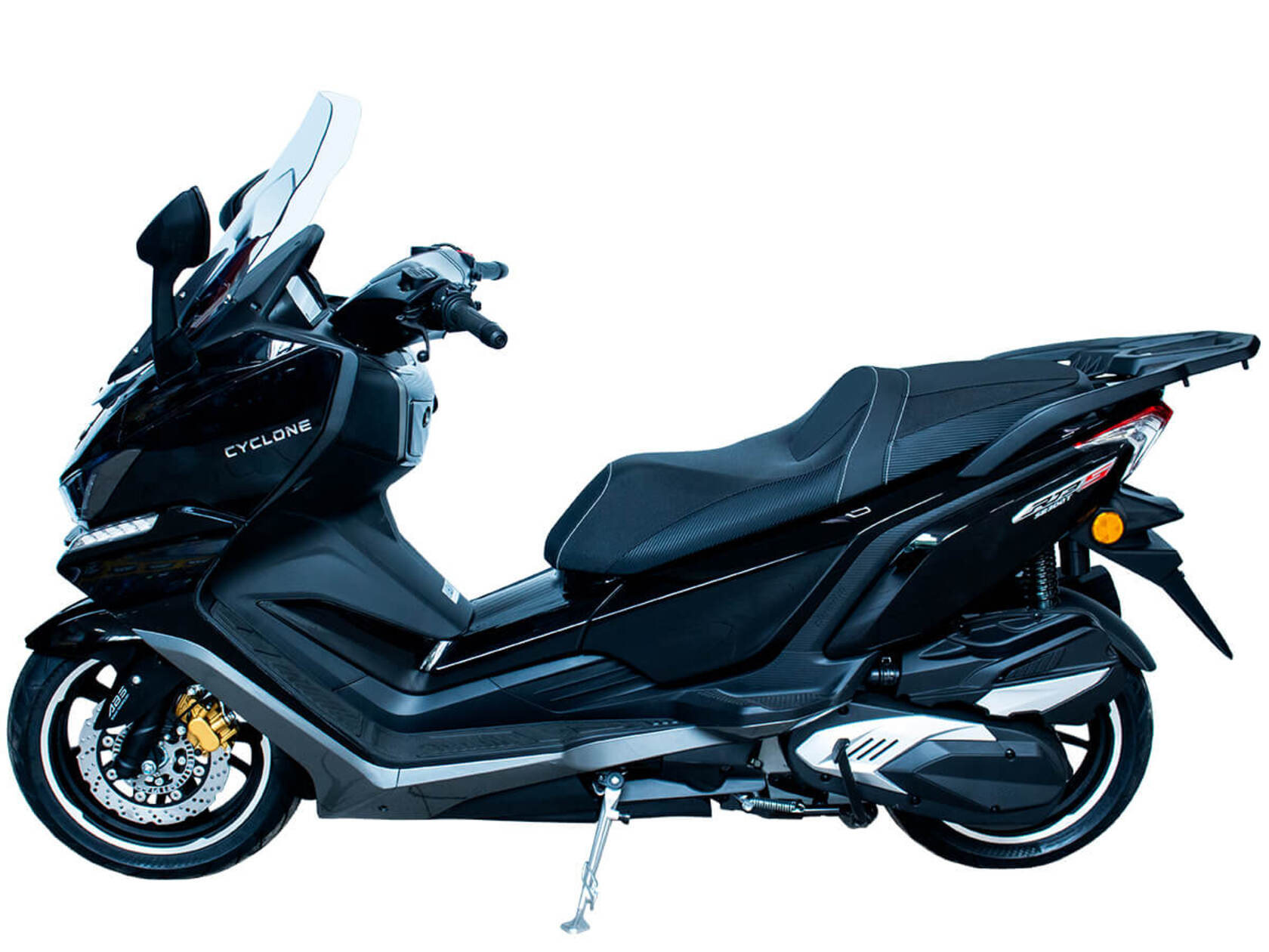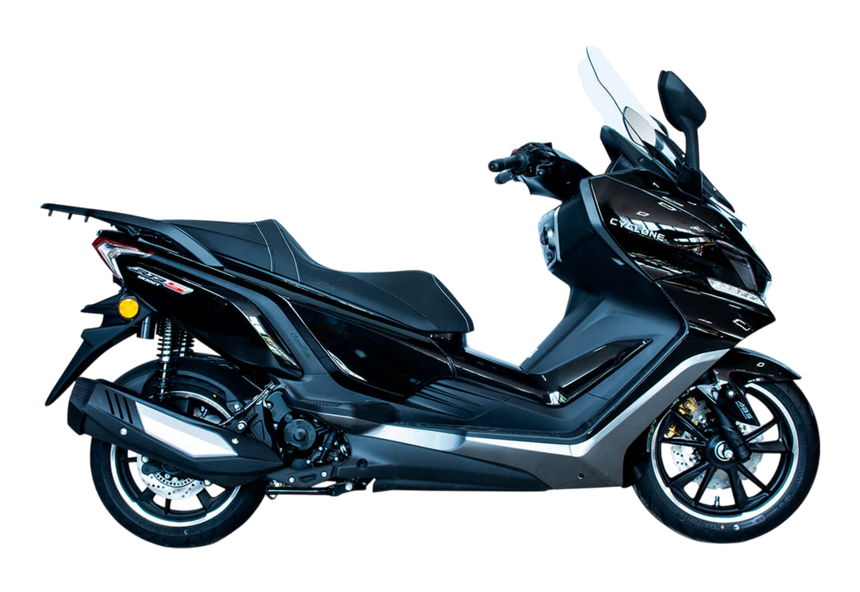 CYCLONE RT3S (SR300T) – городской максискутер, сочетающий в себе мощный двигатель, богатую компоновку и изысканный современный дизайн.Силовая установка представляет собой одноцилиндровый четырёхтактный двигатель объёмом 289 см3 имеет мощность 25 л.с. при 7500 об/мин. Максимальный крутящий момент достигается на 6000 об/мин и составляет 26,5 Н·м. Эти показатели позволяют RT3S по скоростным характеристикам конкурировать не только со скутерами, но и со среднекубатурными мотоциклами.Инжекторный впрыск топлива с блоком управления BOSCH увеличивает топливную экономичность, а также позволяет добиться высокой приёмистости и неприхотливости агрегата. Жидкостная система охлаждения не допустит перегрева двигателя даже при самом агрессивном вождении.На скутер установлен вариатор, который обеспечивает динамичную езду как в условиях городских пробок, так и на скоростных автострадах.Колёса скутера имеют литые диски диаметром 14 и 15 дюймов. Колёса обуты в бескамерные покрышки TIMSUN. Клиренс скутера составляет 155 мм. Подвеска представлена классической телескопической вилкой спереди и двумя газонаполненными амортизаторами сзади. Ход передней подвески составляет 129,5 мм, задней – 97,5 мм.Сухой вес скутера составляет 202 кг. Эффективное и безопасное замедление с любых скоростей обеспечивают гидравлические дисковые тормоза с ABS фирмы BOSCH спереди и сзади.Объём топливного бака этой модели – 17 литров.Модель имеет два видеорегистратора, электрорегулируемое ветровое стекло, подсветку пультов, возможность бесключевого доступа, датчики давления в шинах и USB-порт.Скутер сочетает в себе отличные технические характеристики, комфорт и надёжность, что позволяет вам ощутить настоящую свободу и всегда быть в ритме мегаполиса.
