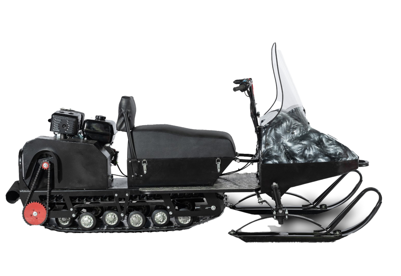 Снегоход Бурлак-М Егерь Стандарт собран на базе стандартной гусеницы. Ширина гусеницы 500 мм. Подвеска: катковая.На модель установлено полутораместное сиденье снегоходного типа. Под сиденьем располагается кофр для вещей. Еще одно багажное отделение расположено под капотом.В качестве дополнительной опции можно установить реверс, тормоз, электрический запуск, подогрев ручек руля и курка газа